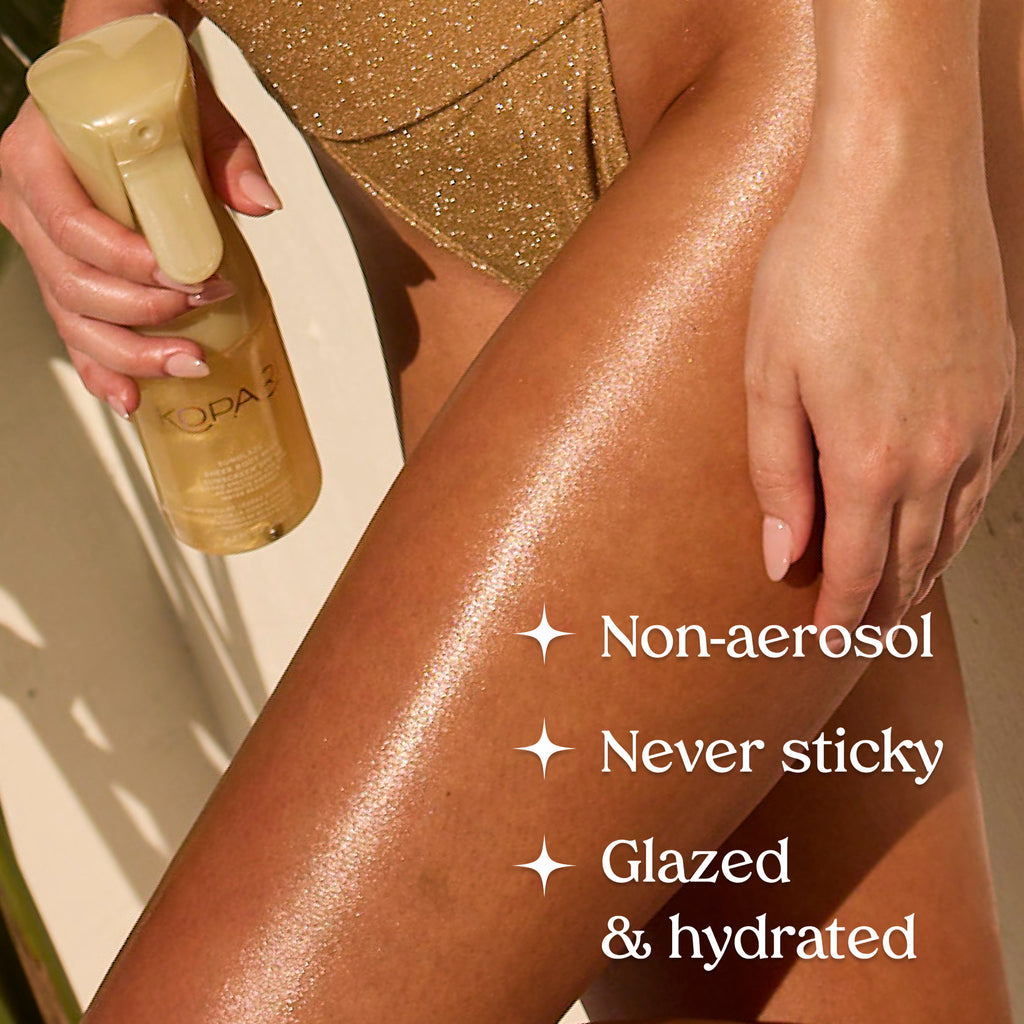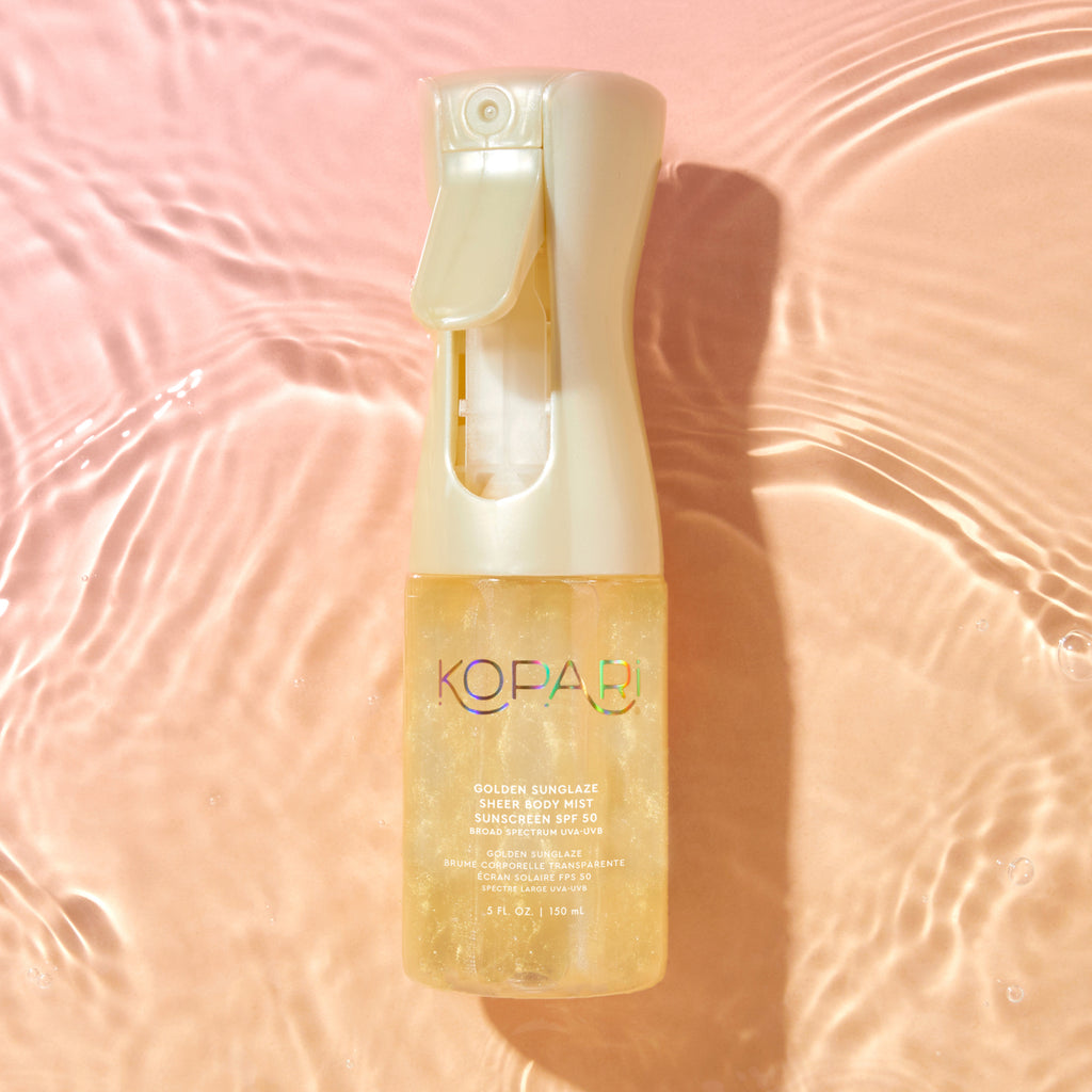 Glow with Kopari's Golden Sunglaze Sheer Body Mist Organic SPF 50. This swirling golden non-aerosol, fast-drying mist offers organic broad-spectrum sun protection with a glowing golden glazed finish. Formulated with hyaluronic acid and antioxidant-rich vitamins C and E, it helps your skin feel soft and supple while providing even, glowing protection with a juicy guava scent.